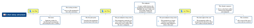 I did a recap on the three act story structure doing a mini-course provided by Reedsy, and I created this mind map for myself. My brain works best if I see the overall picture of things, so this overview helps me to remember at one glance. I have put the structure into a timeline view. Feel free to use it.